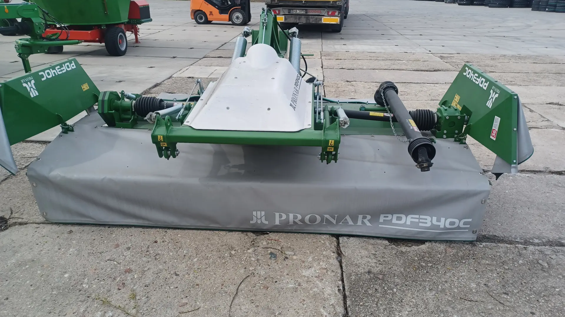 Kosiarka dyskowa PRONAR PDF340C to model kosiarki czołowej ze spulchniaczem pokosu montowanej na przednim trzypunktowym układzie zawieszenia (TUZ). Dodatkowo do obsługi wymagany jest WOM z przodu ciągnika i jedna sekcja hydrauliczna. Szerokość koszenia wynosi aż 3,4m, co wyraźnie wpływa na wydajność i zwiększa funkcjonalność maszyny. Kosiarka dyskowa PRONAR PDF340C została skonstruowana przede wszystkim z myślą o pracy na ciężkim, nierównym terenie. Jej głównym elementem jest wytrzymała i niezawodna listwa tnąca PRONAR, która została wyposażona w dodatkowy profil usztywniający umieszczony w zamkniętym korpusie listwy. Mocna konstrukcja maszyny powstała w oparciu o nowoczesne materiały i technologie produkcyjne. Bezpieczeństwo użytkowania zapewnia sprzęgło cierne przeciążeniowe 1200 Nm. W połączeniu z dużym zakresem kopiowania terenu sprawia, że kosiarka dyskowa PRONAR PDF340C poradzi sobie w każdych warunkach, zachowując przy tym doskonałą jakość cięcia. Wydajność koszenia, przy prędkości 10km/h, wynosi 3,4 ha/h. Do napędu kosiarki dyskowej PRONAR PDF340C wymagany jest ciągnik o mocy co najmniej 95 KM.